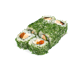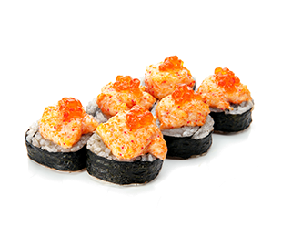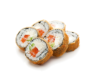 Tempura roll is a simple outside thin roll. It is rolled plain, and is sometimes garninshed with tempura crisps (crunchy roll) and spicy sauce.